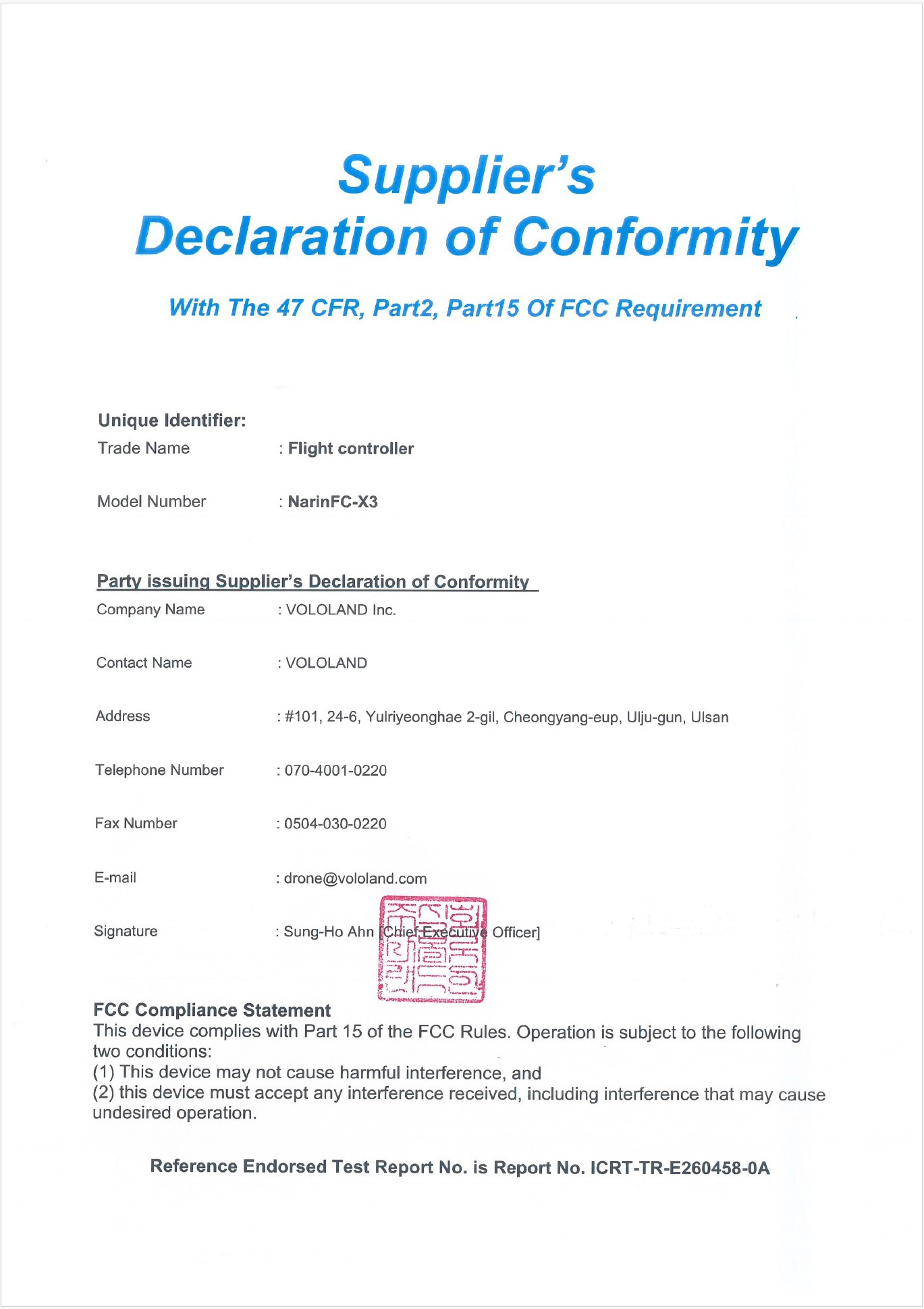 FCC 인증서-비행제어기(NarinFC-H5)